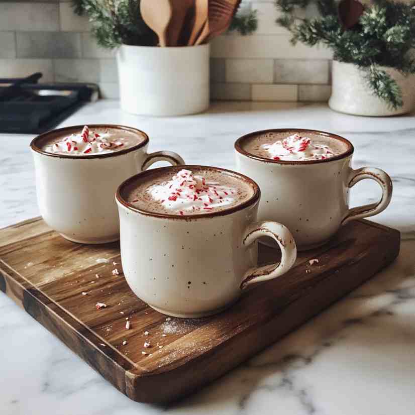 - Pour into mugs and top with whipped cream and crushed peppermint.