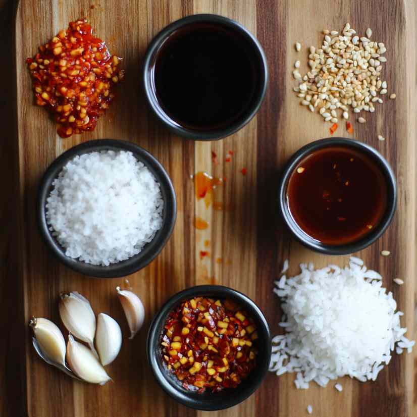 - In a small saucepan, combine honey, soy sauce, sriracha, garlic, chili flakes, and rice vinegar.